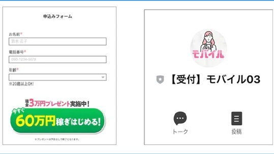 株式会社blueの紹介ページから、「名前」「電話番号」「年齢」を登録すると、モバイルというLINEアカウントへの友達登録を勧められます。