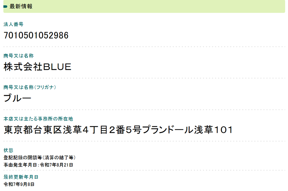 事由発生年月日令和7年8月21日変更の事由登記記録の閉鎖等(清算の結了等)という記載があることから、理由は不明ですが株式会社blueは8月21日時点で実質倒産していることがわかります。